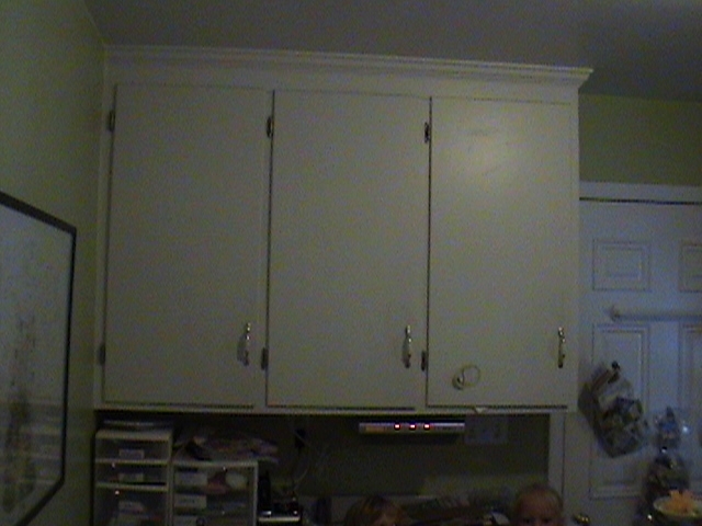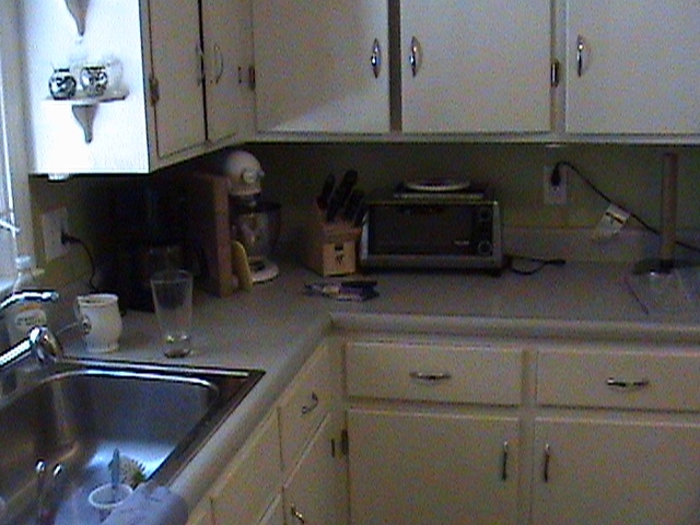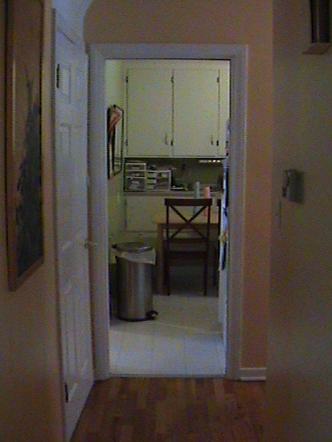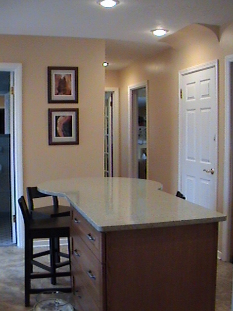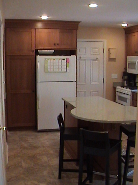 The new kitchen featured Decora Cabinets with a cherry finish. The cabinets were accented with granite counter tops. A major highlight of the kitchen was the central island which provided for bar seating and extra cabinet space that was lost with the removal of the hallway wall. Another cabinet was added under the cased archway with access from both the kitchen and dining room. The relocated refrigerator was surrounded by a large pantry cabinet and upper wall cabinets. The kitchen floor consisted of 13" vinyl tiles. The new appliances included a dishwasher, range, and microwave.