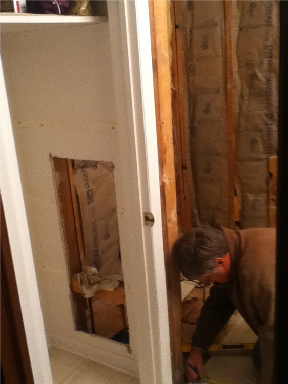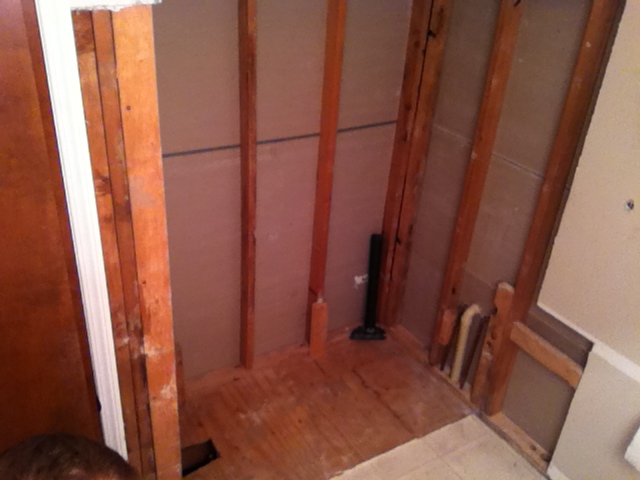 The ceramic tile walls, plaster, and steel tub was removed to show bare studs in preparation for the new shower unit. To provide easy access to the new shower plumbing, an access panel was cut into the adjacent linen closet. Before installing the shower, the exposed walls were insulated to help isolate and reduce noise in the bathroom.