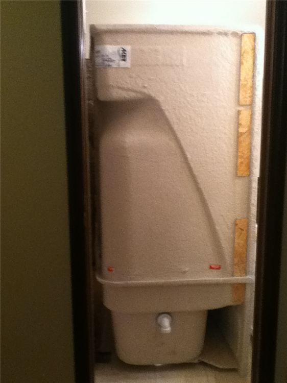 The shower and tub was delivered in three parts. It was assembled within the bathroom and then slid into place. With the shower and tub in place, the plumbing was installed and connected, and drywall was hung and finished. The shower features Moen fixtures and a Basco tempered glass sliding door.