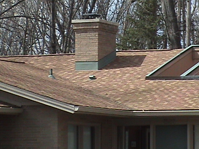 Detail of the flashing around the chimney on this homes shingled roof replacement.